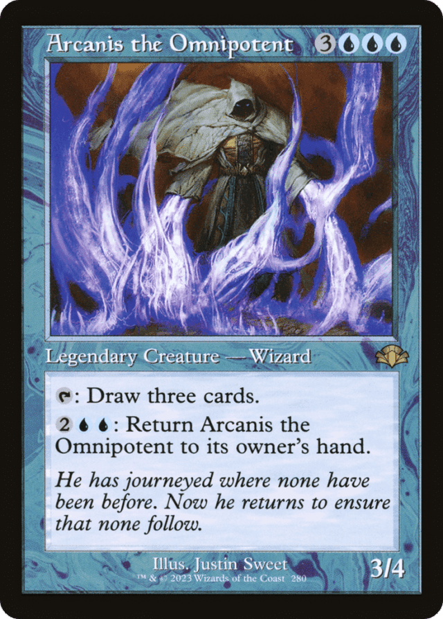 {T}: Draw three cards. {2}{U}{U}: Return Arcanis to its owner's hand.