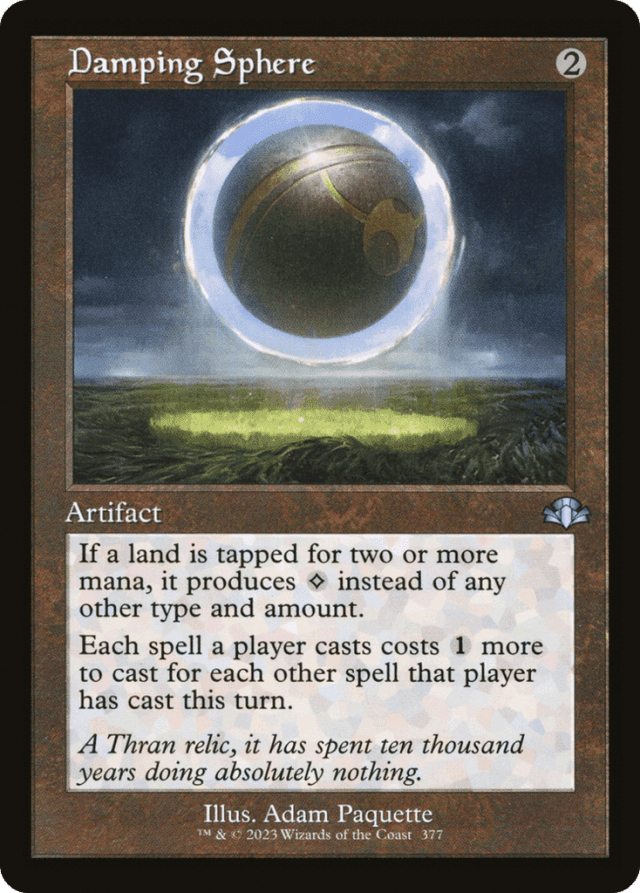 Damping Sphere’s second ability counts spells that were cast during a turn even if Damping Sphere wasn’t on the battlefield as they were cast. For example, if Damping Sphere itself is the third spell you cast in a turn, the next spell you cast costs {3} more to cast. — If multiple replacement effects would modify the mana an ability you control produces, choose one to apply. After that, determine if any others are applicable. A replacement effect can’t apply to the same event more than once. — To determine the total cost of a spell, start with the mana cost or alternative cost (such as a flashback cost) you’re paying, add any cost increases, then apply any cost reductions. The mana value of the spell is determined only by its mana cost, no matter what the total cost to cast the spell was.