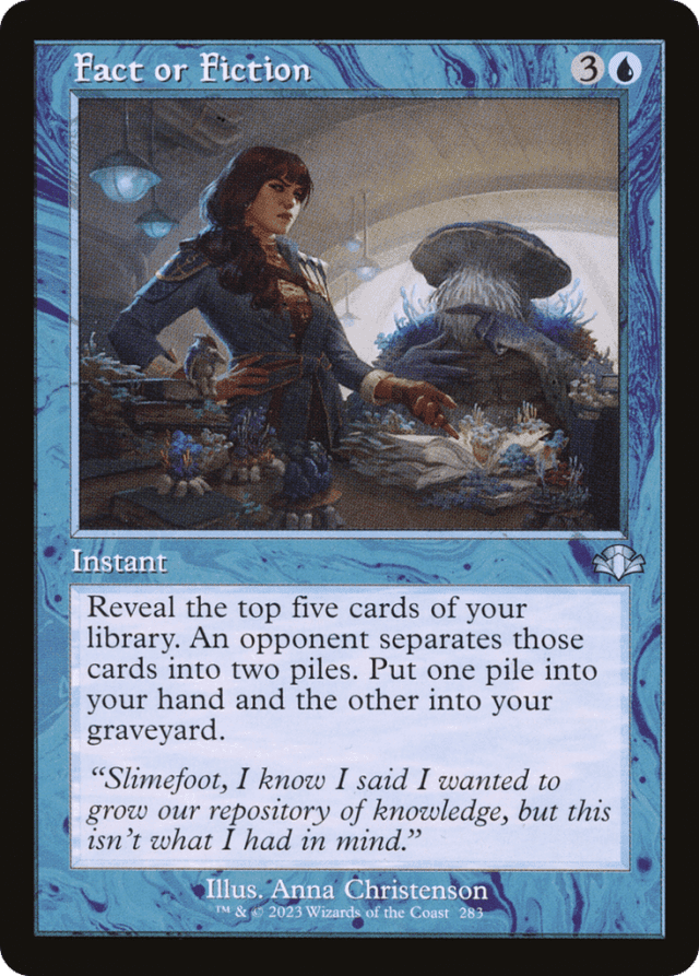 Reveal the top five cards of your library. An opponent separates those cards into two piles. Put one pile into your hand and the other into your graveyard.