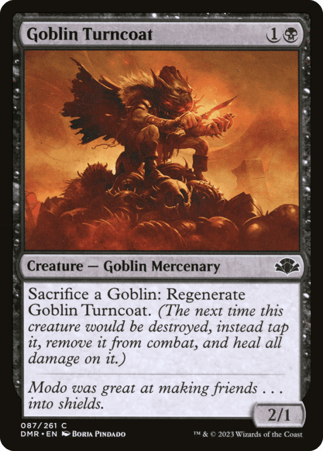 Activating the ability creates a replacement effect that acts like a shield, replacing the next time Goblin Turncoat would be destroyed that turn. This shield works against effects that try to destroy Goblin Turncoat or lethal damage that would be dealt to Goblin Turncoat. — Goblin Turncoat can regenerate even if it isn’t in combat, it’s already tapped, or it’s undamaged. — You can activate the regeneration ability even if Goblin Turncoat isn’t at risk of being destroyed. Sometimes you need to sacrifice Goblins. We understand.