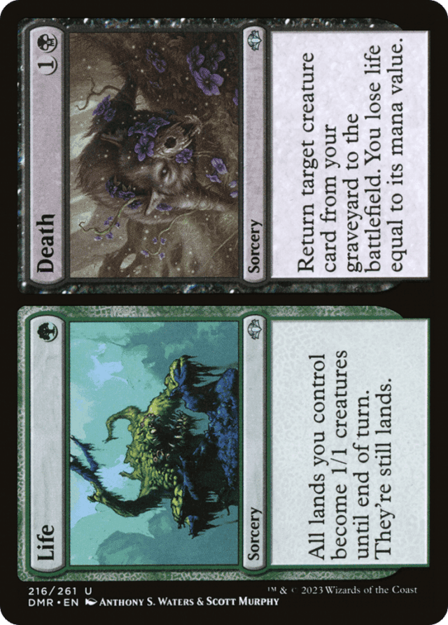 A noncreature permanent that becomes a creature can attack, and its {T} abilities can be activated, only if its controller has continuously controlled that permanent since the beginning of their most recent turn. It doesn't matter how long the permanent has been a creature. Notably, if you turn a land into a creature on the turn it entered the battlefield, you won't be able to tap it for mana. — A split card's characteristics are a combination of its two halves while it is not on the stack. For example, Assault // Battery has a mana value of 5 while it is in your library. If an effect allows you to search your library for a card with mana value 4 or less, you can't find Assault // Battery. — Each split card has two names. If an effect instructs you to choose a card name, you may choose one of those names, but not both. — Each split card is a single card. For example, if you discard a split card, you've discarded one card, not two. If an effect counts the number of sorcery cards in your graveyard, Assault // Battery counts once, not twice. — If an effect allows you to cast a spell with certain characteristics, consider only the characteristics of the half you're casting. For example, if an effect allows you to cast a sorcery spell with mana value 2 or less from among cards in your graveyard, you could cast Assault this way, but not Battery. — If you copy a spell that's half of a split card, the copy copies that same half. For example, if you copy Assault, the copy is also Assault, not Battery. — Lands that become creatures retain any other supertypes, card types, subtypes, and abilities they have. — Split cards have two card faces on a single card. The characteristics of the half you didn't cast are ignored while the spell is on the stack. — To cast a split card, choose one of its halves to cast. There's no way to cast both halves of this split card.