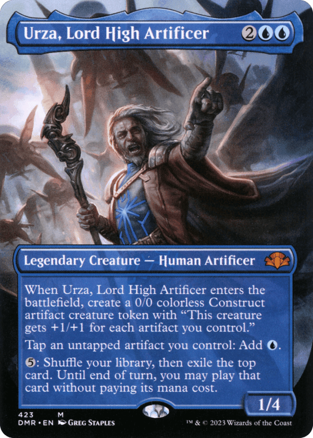 When Urza enters, create a 0/0 colorless Construct artifact creature token with "This token gets +1/+1 for each artifact you control." Tap an untapped artifact you control: Add {U}. {5}: Shuffle your library, then exile the top card. Until end of turn, you may play that card without paying its mana cost.