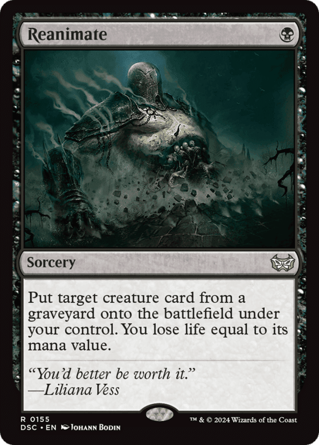 If a card in a player's graveyard has {X} in its mana cost, X is considered to be 0. — If any abilities trigger on the creature entering the battlefield, those abilities resolve after you lose life. If losing life results in you losing the game, those abilities won't resolve. — In a multiplayer game, if a player leaves the game, all cards that player owns leave as well. If you leave the game, the creature you control from Reanimate is exiled. — The amount of life you lose is determined by the mana value of the card in your graveyard, not the creature once it's on the battlefield. — You lose life after the creature is already on the battlefield. Any abilities it has that interact with loss of life, such as that of Platinum Emperion, apply to that loss of life.