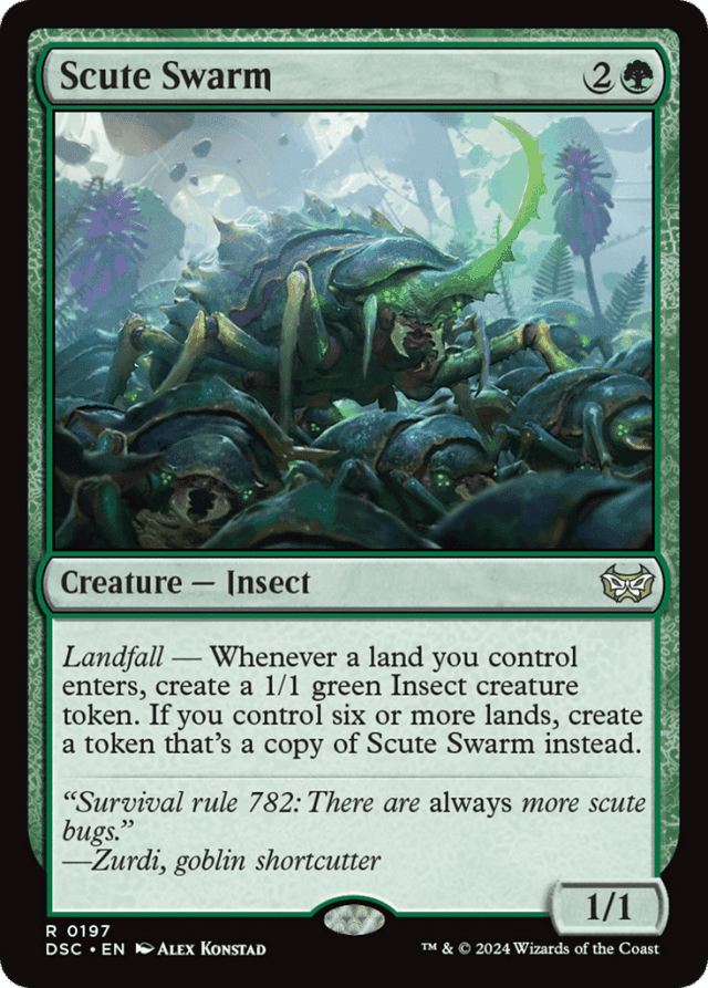 If Scute Swarm leaves the battlefield before its triggered ability resolves, the token will still enter the battlefield as a copy of Scute Swarm, using Scute Swarm's copiable values from when it was last on the battlefield. — The token copy will have Scute Swarm's ability. It will also be able to create copies of itself. — The token copy won't copy counters or damage marked on Scute Swarm, nor will it copy other effects that have changed Scute Swarm's power, toughness, types, color, and so on. Normally, this means the token will simply be a Scute Swarm, but if any copy effects have affected the original Scute Swarm, the token will take those into account. — A landfall ability doesn't trigger if a permanent already on the battlefield becomes a land. — A landfall ability triggers whenever a land you control enters for any reason. It triggers whenever you play a land, as well as whenever a spell or ability puts a land onto the battlefield under your control. — Whenever a land you control enters, each landfall ability of the permanents you control will trigger. You can put them   on the stack in any order. The last ability you put on the stack will be the first one to resolve (As a result, you can have those abilities resolve in the order of your choosing.).