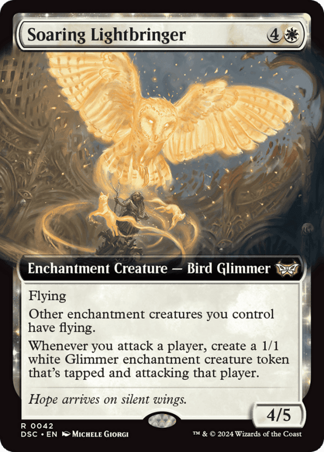 Flying Other enchantment creatures you control have flying. Whenever you attack a player, create a 1/1 white Glimmer enchantment creature token that's tapped and attacking that player.