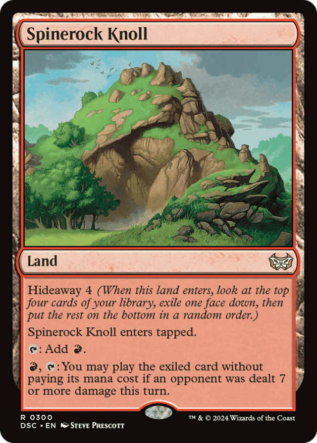 At the time the last ability resolves, you'll get to play the card if a player who is currently your opponent, or a player who was your opponent at the time they left the game, has been dealt 7 damage over the course of the turn. — It doesn't matter how the opponent was dealt damage or by whom, as long as the total damage is 7 or more. You don't specify an opponent when you activate the ability. — You'll get to play the card even if Spinerock Knoll wasn't on the battlefield at the time some or all of the 7 damage was dealt. — "Hideaway N" means "When this permanent enters the battlefield, look at the top N cards of your library. Exile one of them face down and put the rest on the bottom of your library in a random order. The exiled card gains 'The player who controls the permanent that exiled this card may look at this card in the exile zone.'" — Any player who has controlled a permanent with a hideaway ability since a card was exiled with it may look at that card. — Hideaway now causes you to put the rest of the cards on the bottom of your library in a random order instead of any order. — Previously, permanents with hideaway entered the battlefield tapped. This ability has been removed from the definition of hideaway. Older cards have received errata to have an additional paragraph that reads "[This permanent] enters the battlefield tapped," and they now have hideaway 4.
