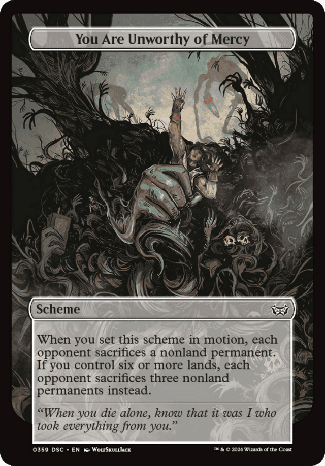 When you set this scheme in motion, each opponent sacrifices a nonland permanent of their choice. If you control six or more lands, each opponent sacrifices three nonland permanents of their choice instead.