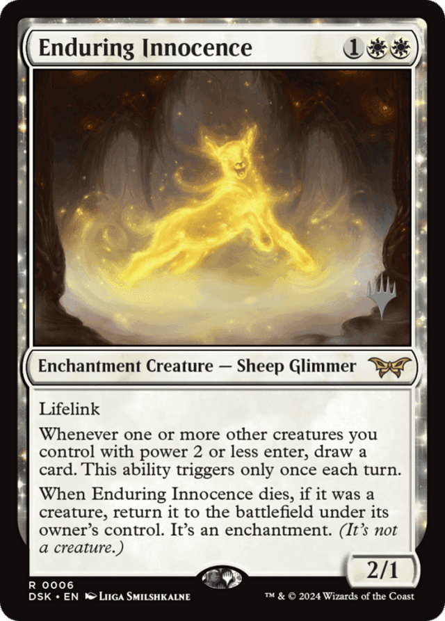 Lifelink Whenever one or more other creatures you control with power 2 or less enter, draw a card. This ability triggers only once each turn. When Enduring Innocence dies, if it was a creature, return it to the battlefield under its owner's control. It's an enchantment. (It's not a creature.)