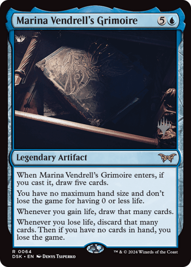 When Marina Vendrell's Grimoire enters, if you cast it, draw five cards. You have no maximum hand size and don't lose the game for having 0 or less life. Whenever you gain life, draw that many cards. Whenever you lose life, discard that many cards. Then if you have no cards in hand, you lose the game.