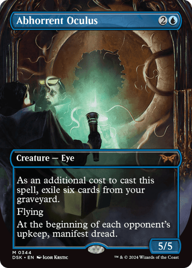 A permanent that turns face up or face down changes characteristics but is otherwise the same permanent. Spells and abilities that were targeting that permanent and Auras and Equipment that were attached to that permanent aren't affected unless the new characteristics of the object change the legality of those targets or attachments. — Abhorrent Oculus's additional cost must be paid even if it's cast "without paying its mana cost" or for any alternative cost. — Any time you have priority, you can turn a manifested permanent you control face up by revealing that it's a creature card (ignoring any copy effects or type-changing effects that might be applying to it) and paying its mana cost. This is a special action. It doesn't use the stack and can't be responded to. — At any time, you can look at a face-down spell or permanent you control. You can't look at face-down permanents or spells you don't control unless an effect instructs or allows you to do so. — Because face-down creatures don't have a name, they can't have the same name as any other creature, even another face-down creature. — Because the permanent is on the battlefield both before and after it's turned face up, turning a permanent face up doesn't cause any enters-the-battlefield abilities to trigger. — If a double-faced card is manifested, it will be put onto the battlefield face down. While face down, it can't transform. If the front face of the card is a creature card, you can turn it face up by paying its mana cost. If you do, its front face will be up. — If a face-down creature loses its abilities, it can't be turned face up with a disguise or morph ability because it will no longer have that ability (or the associated cost) once face up. — If a face-down spell leaves the stack and goes to any zone other than the battlefield (if it was countered, for example), you must reveal it. Similarly, if a face-down permanent leaves the battlefield, you must reveal it. You must also reveal all face-down spells and permanents you control if you leave the game or the game ends. — If a manifested creature would have disguise or morph if it were face up, you may also turn it face up by paying its disguise or morph cost, as appropriate. — If something tries to turn a face-down instant or sorcery card on the battlefield face up, reveal that card to show all players it's an instant or sorcery card. The permanent remains on the battlefield face down. Abilities that trigger when a permanent turns face up won't trigger, because even though you revealed the card, it never turned face up. — If your library contains only one card when you manifest dread, you'll look at that card and put it onto the battlefield face down. You won't have the option to put it into your graveyard instead. If your library contains no cards when you manifest dread, you won't do anything. — Some cards in the Duskmourn release have abilities that trigger "whenever you manifest dread." In circumstances where you are instructed to manifest dread but can't perform some or all of the steps of manifesting dread (probably because your library has one or fewer cards in it), these abilities will still trigger. — To manifest dread, look at the top two cards of your library. Manifest one (by putting it onto the battlefield face down) and put the other into your graveyard. The card you put onto the battlefield becomes a 2/2 face-down creature with no name, mana cost, creature types, or abilities. It's colorless and has a mana value of 0. Other effects that apply to the permanent can still grant it any characteristics it doesn't have or change the characteristics it does have. — Turning a permanent face up or face down doesn't change whether that permanent is tapped or untapped. — Unlike a face-down creature that was cast using a disguise or morph ability, a manifested creature may still be turned face up after it loses its abilities if it's a creature card. — You must ensure that your face-down spells and permanents can be easily differentiated from each other. You're not allowed to mix up the cards that represent them on the battlefield to confuse other players. The order in which they entered should remain clear, as well as what ability caused them to be face down. (This includes manifest, disguise, cloak, morph, and a few older effects that turn cards face down.) Common methods for doing this include using markers or dice, or simply placing them in order on the battlefield.
