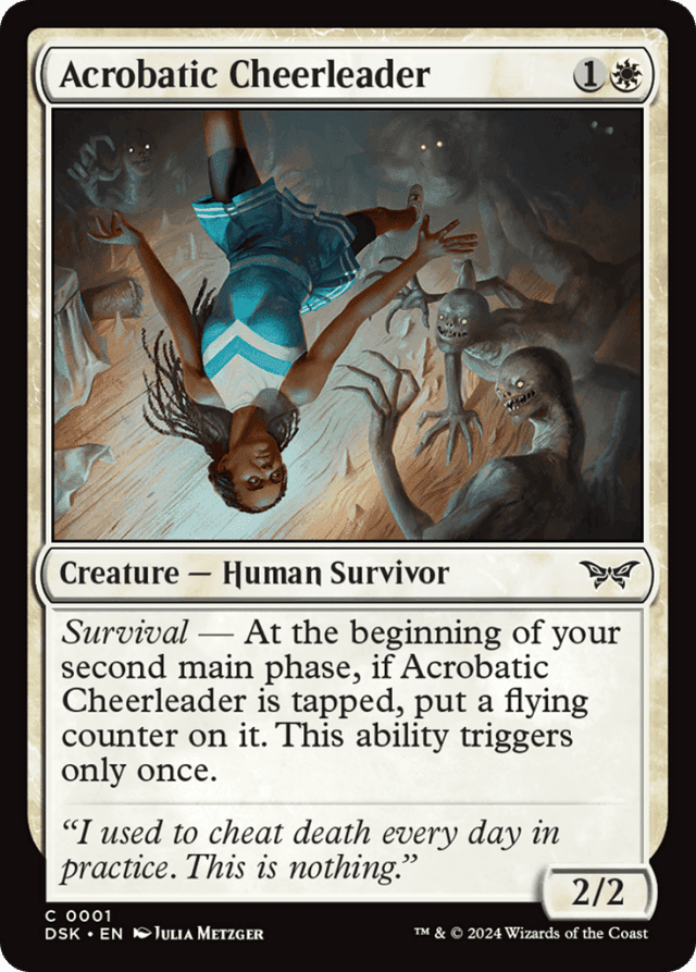 If Acrobatic Cheerleader leaves the battlefield and then returns, it's a new object with no memory of its previous existence. Its ability will be able to trigger again. — If a creature with a survival ability isn't tapped when your second main phase begins, the ability won't trigger at all. You won't be able to tap it during your second main phase in time to have that ability trigger. — If a creature's survival ability triggers but that creature is untapped when the ability begins to resolve, that ability won't do anything. — If a creature's survival ability triggers but the creature leaves the battlefield before the ability resolves, use its tapped or untapped status as it last existed on the battlefield to determine whether or not the ability will do anything. — Once Acrobatic Cheerleader's ability triggers, it won't trigger again as long as it remains on the battlefield, even if the triggered ability is countered or the flying counter is somehow removed. If an effect would cause Acrobatic Cheerleader's ability to trigger again, that part of the effect won't do anything. — Survival abilities (and other abilities that trigger at the beginning of your second main phase) will trigger at the beginning of the second main phase you take in a turn. They won't trigger during your third, fourth, or other additional main phases in a single turn, if effects somehow cause you to have more than two main phases.