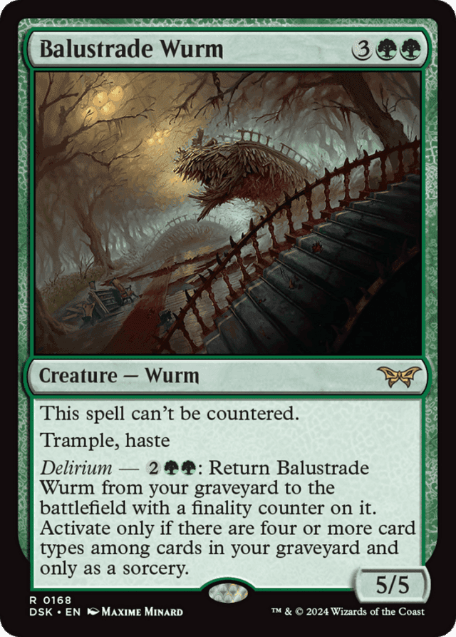 This spell can't be countered. Trample, haste Delirium — {2}{G}{G}: Return this card from your graveyard to the battlefield with a finality counter on it. Activate only if there are four or more card types among cards in your graveyard and only as a sorcery.