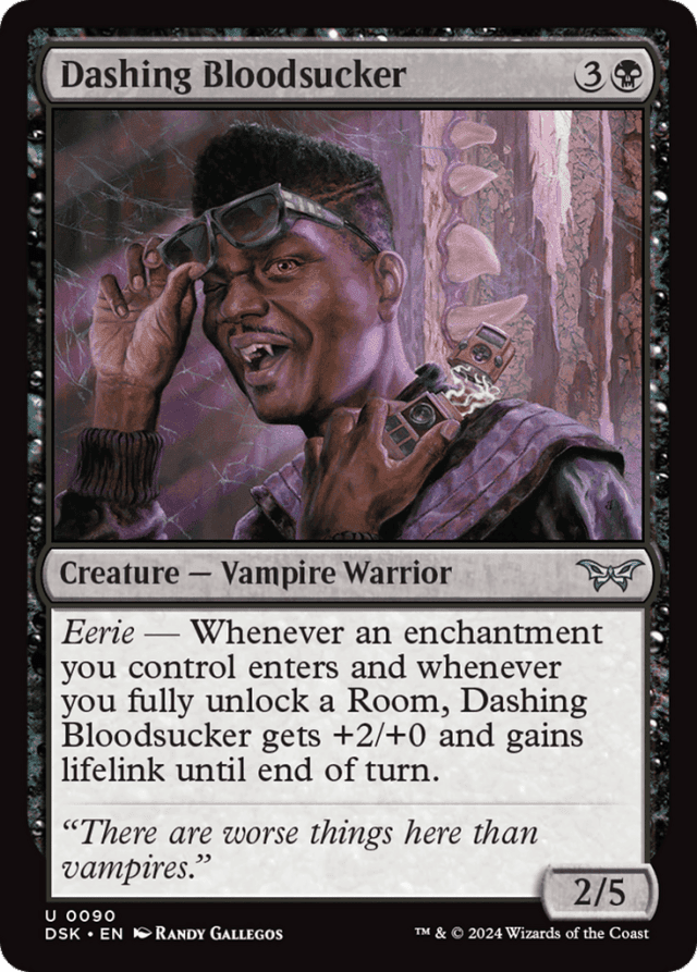Eerie — Whenever an enchantment you control enters and whenever you fully unlock a Room, this creature gets +2/+0 and gains lifelink until end of turn.