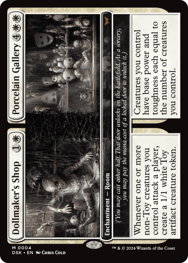 An ability that triggers "when you unlock this door" triggers when that door becomes unlocked. This can happen one of two ways: (1) the door becomes unlocked on the battlefield or (2) the door becomes unlocked as the Room enters the battlefield because you cast the corresponding half. In the latter case, since the door becoming unlocked is what causes the ability to trigger, effects that cause abilities that trigger when a permanent enters to trigger an additional time (such as that of Panharmonicon) won't apply. — An ability that triggers "whenever you fully unlock a Room" triggers when a door becomes unlocked and the other door of that Room is already unlocked, or when both doors of that Room become unlocked simultaneously. — Any time you have priority during a main phase of your turn and the stack is empty, you may pay the mana cost of a locked door (also called its "unlock cost"). That door becomes unlocked. This is a special action. It doesn't use the stack and can't be responded to. — Because damage remains marked on creatures until the damage is removed as the turn ends, nonlethal damage dealt to creatures you control while Porcelain Gallery is unlocked may become lethal if other creatures you control leave the battlefield during that turn. — Creatures that enter attacking are never declared as attackers, and as such, they won't cause Dollmaker's Shop's ability to trigger. — Dollmaker's Shop's ability will trigger once for each player you attack with one or more non-Toy creatures. — Each Room card has two names. If an effect instructs you to choose a card name, you may choose one of those names, but not both. — Each Room card is a single card. For example, if you discard a Room card, you've discarded one card, not two. If an effect counts the number of enchantment cards in your graveyard, Bottomless Pool // Locker Room counts once, not twice. — Effects that modify a creature's power and/or toughness, such as the effect of Jump Scare, will apply to that creature no matter when they started to take effect. The same is true for any counters that change its power and/or toughness and effects that switch its power and toughness. — If a Room enters from any zone other than the stack, it will enter with both halves locked. — If a spell or ability would create a copy of a Room spell on the stack, the copy retains the choice of which door was cast but also retains the full characteristics of the spell. The characteristics of the door that wasn't cast are still ignored while the copy is on the stack, and when the copy resolves, the token it becomes will enter with the appropriate door unlocked. — If an effect allows you to cast a spell with certain characteristics, consider only the characteristics of the door you're casting. For example, if an effect allows you to cast a permanent spell with mana value 3 or less from among cards in your graveyard, you could cast Bottomless Pool this way, but not Locker Room. — If neither door of a Room is unlocked, it's a Room enchantment with no name and no abilities. — Porcelain Gallery's ability overrides all previous effects that set the base power and toughness of creatures you control to specific values. Any power- or toughness-setting effects that start to apply to a creature you control after Porcelain Gallery is unlocked will overwrite this effect on that creature. — Room cards have two card faces with a shared type line on a single card. The characteristics of the door you didn't cast are ignored while the spell is on the stack. — Some abilities allow you to lock a door of a Room you control. You can't choose to lock a door that's already locked with such an ability. If such an ability requires a target, you can target a Room even if both of its doors are locked, but the ability won't do anything when it resolves. — Some abilities allow you to unlock a door of a Room you control. You can't choose to unlock a door that's already unlocked with such an ability. If such an ability requires a target, you can target a Room even if both of its doors are unlocked, but the ability won't do anything when it resolves. — Some doors have abilities that trigger whenever you unlock that door and require one or more targets. You can unlock that door even if there would be insufficient legal targets for that triggered ability. The triggered ability won't go on the stack. — To cast a Room spell, choose a half (or "door") to cast. There's no way to cast both halves of a Room card. When the Room spell resolves, the corresponding door becomes unlocked as the Room enters. — While in any zone other than the stack or the battlefield, a Room card's characteristics are a combination of its two doors. For example, Bottomless Pool // Locker Room has a mana value of 6 while it's in your library. If an effect allows you to search your library for a card with mana value 4 or less, you can't find Bottomless Pool // Locker Room. — While on the battlefield, a Room's characteristics are a combination of the characteristics of its unlocked doors. For example, if Bottomless Pool // Locker Room is on the battlefield with both doors unlocked, its names are Bottomless Pool and Locker Room, its mana value is 6, it's a Room Enchantment, and it has the abilities in each door's text box.