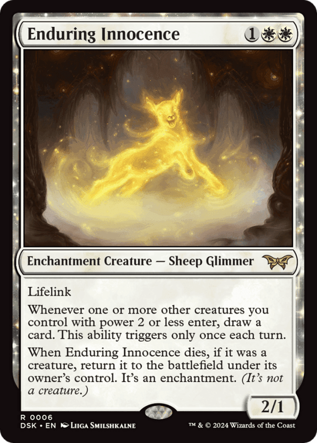Lifelink Whenever one or more other creatures you control with power 2 or less enter, draw a card. This ability triggers only once each turn. When Enduring Innocence dies, if it was a creature, return it to the battlefield under its owner's control. It's an enchantment. (It's not a creature.)