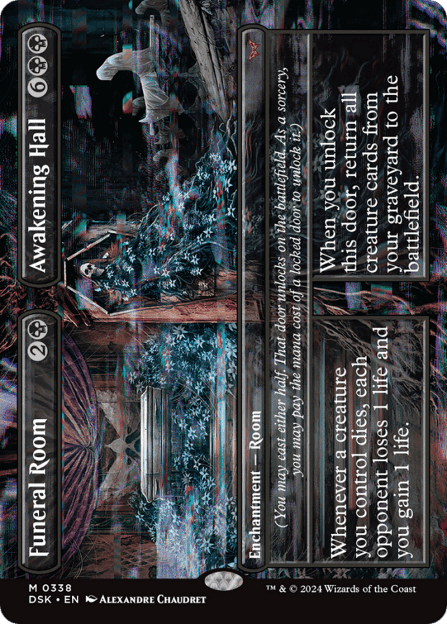 An ability that triggers "when you unlock this door" triggers when that door becomes unlocked. This can happen one of two ways: (1) the door becomes unlocked on the battlefield or (2) the door becomes unlocked as the Room enters the battlefield because you cast the corresponding half. In the latter case, since the door becoming unlocked is what causes the ability to trigger, effects that cause abilities that trigger when a permanent enters to trigger an additional time (such as that of Panharmonicon) won't apply. — An ability that triggers "whenever you fully unlock a Room" triggers when a door becomes unlocked and the other door of that Room is already unlocked, or when both doors of that Room become unlocked simultaneously. — Any time you have priority during a main phase of your turn and the stack is empty, you may pay the mana cost of a locked door (also called its "unlock cost"). That door becomes unlocked. This is a special action. It doesn't use the stack and can't be responded to. — Each Room card has two names. If an effect instructs you to choose a card name, you may choose one of those names, but not both. — Each Room card is a single card. For example, if you discard a Room card, you've discarded one card, not two. If an effect counts the number of enchantment cards in your graveyard, Bottomless Pool // Locker Room counts once, not twice. — If Funeral Room is unlocked and this Room leaves the battlefield at the same time one or more creatures you control die, its ability will trigger once for each of those creatures. — If a Room enters from any zone other than the stack, it will enter with both halves locked. — If a spell or ability would create a copy of a Room spell on the stack, the copy retains the choice of which door was cast but also retains the full characteristics of the spell. The characteristics of the door that wasn't cast are still ignored while the copy is on the stack, and when the copy resolves, the token it becomes will enter with the appropriate door unlocked. — If an effect allows you to cast a spell with certain characteristics, consider only the characteristics of the door you're casting. For example, if an effect allows you to cast a permanent spell with mana value 3 or less from among cards in your graveyard, you could cast Bottomless Pool this way, but not Locker Room. — If neither door of a Room is unlocked, it's a Room enchantment with no name and no abilities. — Room cards have two card faces with a shared type line on a single card. The characteristics of the door you didn't cast are ignored while the spell is on the stack. — Some abilities allow you to lock a door of a Room you control. You can't choose to lock a door that's already locked with such an ability. If such an ability requires a target, you can target a Room even if both of its doors are locked, but the ability won't do anything when it resolves. — Some abilities allow you to unlock a door of a Room you control. You can't choose to unlock a door that's already unlocked with such an ability. If such an ability requires a target, you can target a Room even if both of its doors are unlocked, but the ability won't do anything when it resolves. — Some doors have abilities that trigger whenever you unlock that door and require one or more targets. You can unlock that door even if there would be insufficient legal targets for that triggered ability. The triggered ability won't go on the stack. — To cast a Room spell, choose a half (or "door") to cast. There's no way to cast both halves of a Room card. When the Room spell resolves, the corresponding door becomes unlocked as the Room enters. — While in any zone other than the stack or the battlefield, a Room card's characteristics are a combination of its two doors. For example, Bottomless Pool // Locker Room has a mana value of 6 while it's in your library. If an effect allows you to search your library for a card with mana value 4 or less, you can't find Bottomless Pool // Locker Room. — While on the battlefield, a Room's characteristics are a combination of the characteristics of its unlocked doors. For example, if Bottomless Pool // Locker Room is on the battlefield with both doors unlocked, its names are Bottomless Pool and Locker Room, its mana value is 6, it's a Room Enchantment, and it has the abilities in each door's text box.