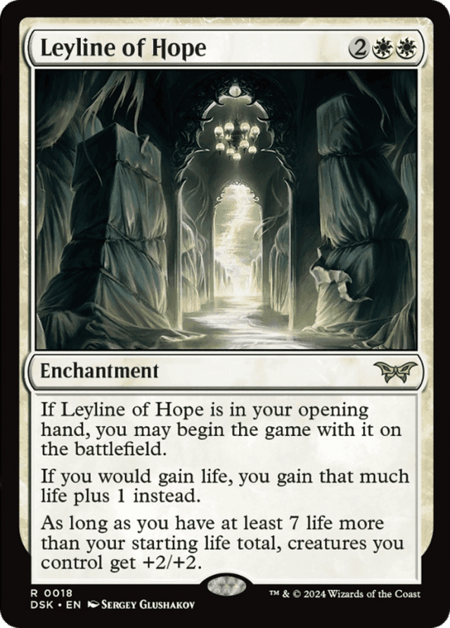 A player's "opening hand" is the hand of cards the player has after all players have taken mulligans. If players have any cards in hand that allow actions to be taken with them from a player's opening hand, the starting player takes all such actions first in any order, followed by each other player in turn order. Then the first turn begins. — Because damage remains marked on creatures until the damage is removed as the turn ends, nonlethal damage dealt to creatures you control may become lethal if Leyline of Hope leaves the battlefield or if your life total drops below 7 life more than your starting life total. — Each creature with lifelink dealing combat damage causes a separate life-gaining event. For example, if two creatures you control with lifelink deal combat damage at the same time, Leyline of Hope's second ability will apply to those two events separately. However, if a single creature you control with lifelink deals combat damage to multiple permanents and/or players at the same time (perhaps because it has trample or was blocked by more than one creature), the ability will apply only once. — If you control two Leylines of Hope and you would gain life, you gain that much life plus 2. A third Leyline of Hope has you gain that much life plus 3, and so on. — In a Two-Headed Giant game, life gained by your teammate won't cause Leyline of Hope's second ability to apply, even though it will cause your team's life total to increase. — The second ability of Leyline of Hope applies just once to each life-gaining event, no matter how much life is gained. If you gain an amount of life "for each" of something or "equal to the number" of something, that life is gained as one event and Leyline of Hope's second ability applies only once.