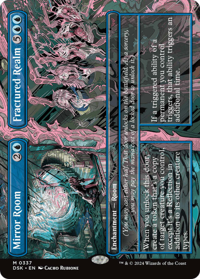 Abilities that apply "as [this creature] enters" or "as [this creature] is turned face up" are also unaffected by Fractured Realm's ability. — Abilities that apply "when [this creature] is turned face up" will trigger an additional time due to Fractured Realm's ability. — An ability that triggers "when you unlock this door" triggers when that door becomes unlocked. This can happen one of two ways: (1) the door becomes unlocked on the battlefield or (2) the door becomes unlocked as the Room enters the battlefield because you cast the corresponding half. In the latter case, since the door becoming unlocked is what causes the ability to trigger, effects that cause abilities that trigger when a permanent enters to trigger an additional time (such as that of Panharmonicon) won't apply. — An ability that triggers "whenever you fully unlock a Room" triggers when a door becomes unlocked and the other door of that Room is already unlocked, or when both doors of that Room become unlocked simultaneously. — Any enters abilities of the copied creature will trigger when the token enters. Any "as [this creature] enters" or "[this creature] enters with" abilities of the copied creature will also work. — Any time you have priority during a main phase of your turn and the stack is empty, you may pay the mana cost of a locked door (also called its "unlock cost"). That door becomes unlocked. This is a special action. It doesn't use the stack and can't be responded to. — Each Room card has two names. If an effect instructs you to choose a card name, you may choose one of those names, but not both. — Each Room card is a single card. For example, if you discard a Room card, you've discarded one card, not two. If an effect counts the number of enchantment cards in your graveyard, Bottomless Pool // Locker Room counts once, not twice. — Except for the stated exception, the token created by Mirror Room's ability copies exactly what was printed on the original creature and nothing else (unless that creature is copying something else or is a token; see below). It doesn't copy whether that creature is tapped or untapped, whether it has any counters on it or Auras and Equipment attached to it, or any non-copy effects that have changed its power, toughness, types, color, and so on. — Fractured Realm's ability doesn't copy the triggered ability; it just causes the ability to trigger an additional time. Any choices made as you put the ability onto the stack, such as modes and targets, are made separately for each instance of the ability. Any choices made on resolution, such as whether to put counters on a permanent, are also made individually. — If a Room enters from any zone other than the stack, it will enter with both halves locked. — If a spell or ability would create a copy of a Room spell on the stack, the copy retains the choice of which door was cast but also retains the full characteristics of the spell. The characteristics of the door that wasn't cast are still ignored while the copy is on the stack, and when the copy resolves, the token it becomes will enter with the appropriate door unlocked. — If a triggered ability is linked to a second ability, additional instances of that triggered ability are also linked to that second ability. If the second ability refers to "the exiled card," it refers to all cards exiled by instances of the triggered ability. — If an effect allows you to cast a spell with certain characteristics, consider only the characteristics of the door you're casting. For example, if an effect allows you to cast a permanent spell with mana value 3 or less from among cards in your graveyard, you could cast Bottomless Pool this way, but not Locker Room. — If neither door of a Room is unlocked, it's a Room enchantment with no name and no abilities. — If the copied creature has {X} in its mana cost, X is 0. — If the copied creature is a token, the token that's created copies the original characteristics of that token as stated by the effect that created that token, with the stated exception. — If the copied creature is copying something else, then the token enters as whatever that creature copied, with the stated exception. — In some cases involving linked abilities, an ability requires information about "the exiled card." When this happens, the ability gets multiple answers. If these answers are being used to determine the value of a variable, the sum is used. For example, if Elite Arcanist's enters-the-battlefield ability triggers twice, two cards are exiled. The value of X in the activation cost of Elite Arcanist's other ability is the sum of the two cards' mana values. As the ability resolves, you create copies of both cards and can cast none, one, or both of the copies in any order. — Replacement effects are unaffected by Fractured Realm's ability. For example, a 1/1 creature that enters under your control "with a +1/+1 counter on it" won't receive an additional +1/+1 counter. — Room cards have two card faces with a shared type line on a single card. The characteristics of the door you didn't cast are ignored while the spell is on the stack. — Some abilities allow you to lock a door of a Room you control. You can't choose to lock a door that's already locked with such an ability. If such an ability requires a target, you can target a Room even if both of its doors are locked, but the ability won't do anything when it resolves. — Some abilities allow you to unlock a door of a Room you control. You can't choose to unlock a door that's already unlocked with such an ability. If such an ability requires a target, you can target a Room even if both of its doors are unlocked, but the ability won't do anything when it resolves. — Some doors have abilities that trigger whenever you unlock that door and require one or more targets. You can unlock that door even if there would be insufficient legal targets for that triggered ability. The triggered ability won