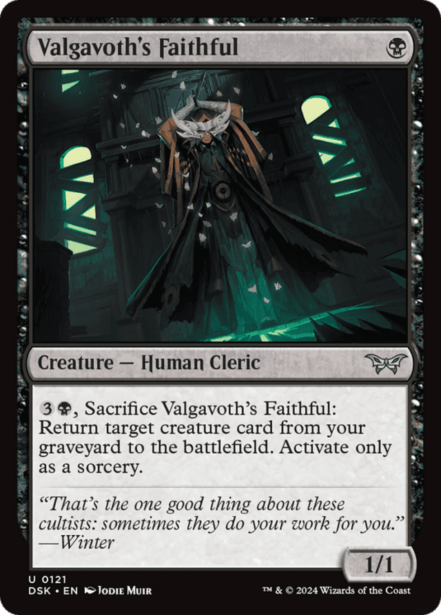 Since targets are chosen before costs are paid, Valgavoth's Faithful isn't a legal target for its own ability because it won't be in the graveyard at that time.
