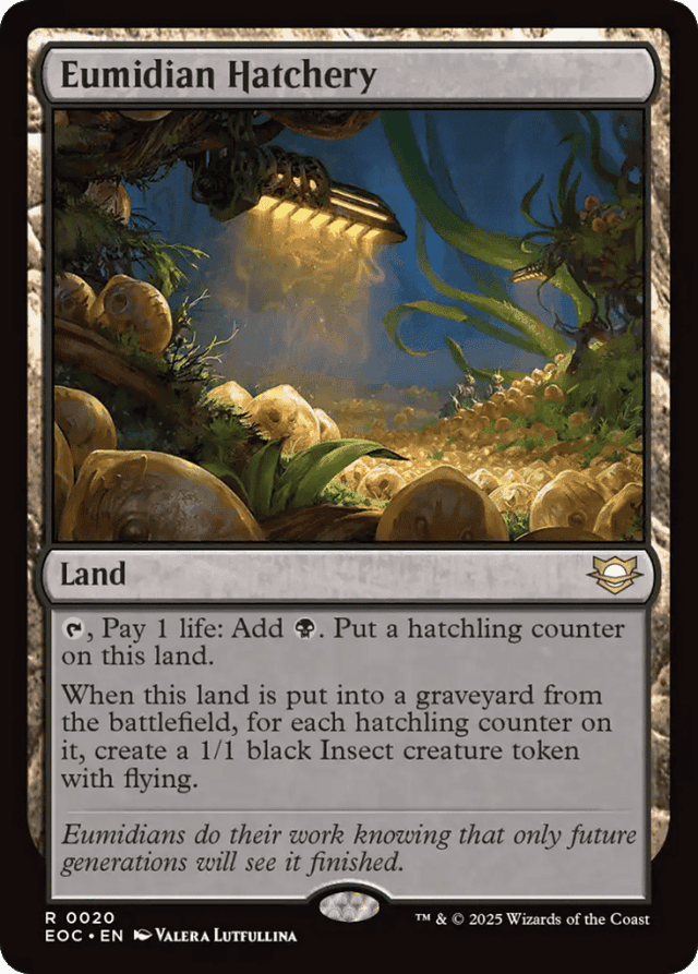 {T}, Pay 1 life: Add {B}. Put a hatchling counter on this land. When this land is put into a graveyard from the battlefield, for each hatchling counter on it, create a 1/1 black Insect creature token with flying.