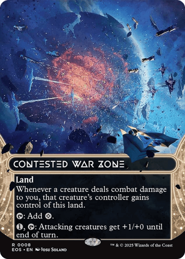 Gaining control of Contested War Zone doesn’t cause it to tap or untap. — In some multiplayer formats, creatures controlled by different players may deal combat damage to you simultaneously. If this happens, you control each triggered ability and can put them on the stack in any order. The last ability to resolve will determine who ends up controlling Contested War Zone. — The last activated ability affects all attacking creatures, not just those you control. — The word “you” in a permanent’s trigger condition always refers to the permanent’s current controller.