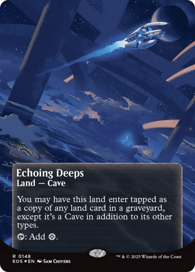 Any enters-the-battlefield abilities of the copied land card will trigger when Echoing Deeps enters the battlefield. Any "as [this land] enters the battlefield" or "[this land] enters the battlefield with" abilities of the chosen land card will also work. — Echoing Deeps copies exactly what was printed on the original land card, with the noted exception. — If you choose to have Echoing Deeps not copy anything, it enters the battlefield untapped.