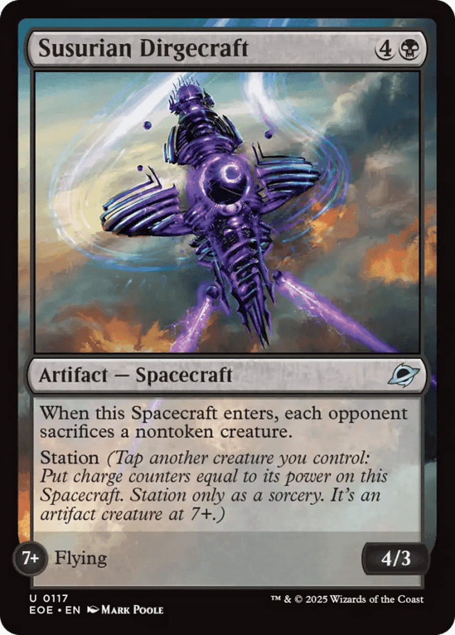 When this Spacecraft enters, each opponent sacrifices a nontoken creature. Station (Tap another creature you control: Put charge counters equal to its power on this Spacecraft. Station only as a sorcery. It's an artifact creature at 7+.) Station 7+: Flying