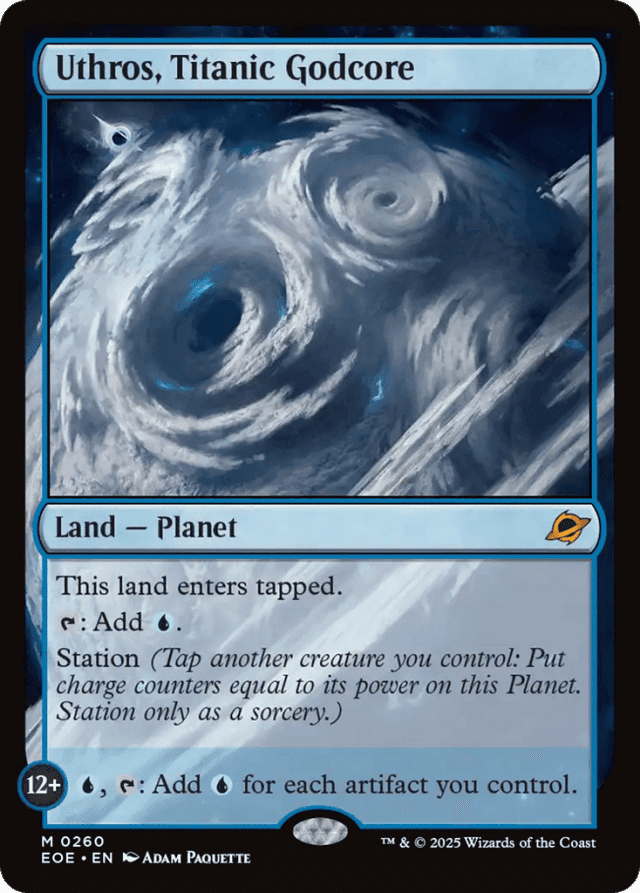 This land enters tapped. {T}: Add {U}. Station (Tap another creature you control: Put charge counters equal to its power on this Planet. Station only as a sorcery.) Station 12+: {U}, {T}: Add {U} for each artifact you control.