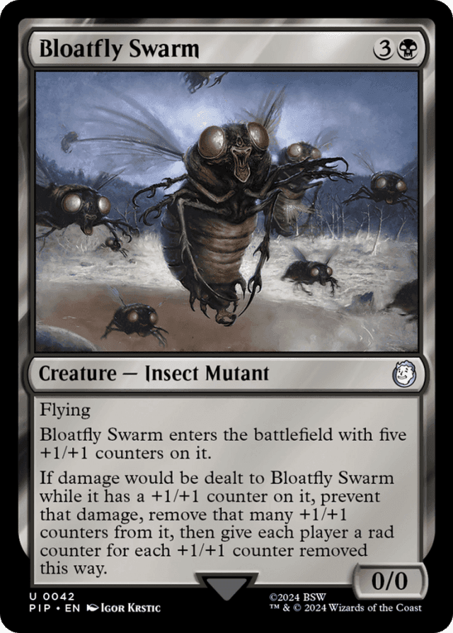 Any effects (such as proliferate) that interact with counters a player gets, has, or loses can interact with rad counters. — If a player has fewer cards remaining in their library than the number of rad counters they have when the triggered ability resolves, they'll mill as many cards as they can. — If damage that can't be prevented is dealt to Bloatfly Swarm, you still remove that many +1/+1 counters from it, and you still give each player a rad counter for each +1/+1 counter removed this way. — In a game using the shared team turns option, such as an Archenemy or Two-Headed Giant game, the inherent triggered ability associated with rad counters triggers once for each player on the active team that has rad counters. Each instance of that ability is controlled by one of those players. — Keep track of how many rad counters each player has. Potential ways to track this include writing them down on paper or using dice, but any method that is clear and mutually agreeable is fine. — Rad counters are a kind of counter that a player may have. They're not associated with any specific permanents. — Rad counters don't go away as steps, phases, or turns end. They only go away when an effect instructs a player to remove rad counters from themselves. — The cards are milled all at once, which means abilities that trigger "whenever one or more nonland cards are milled" will trigger exactly once as long as at least one nonland card was milled. — There is an inherent triggered ability associated with having rad counters. This triggered ability has no source and is controlled by the active player. The full text of this ability is "At the beginning of the precombat main phase of a player with rad counters, that player mills cards equal to the number of rad counters they have. For each nonland card milled this way, that player loses 1 life and removes one rad counter from themselves."