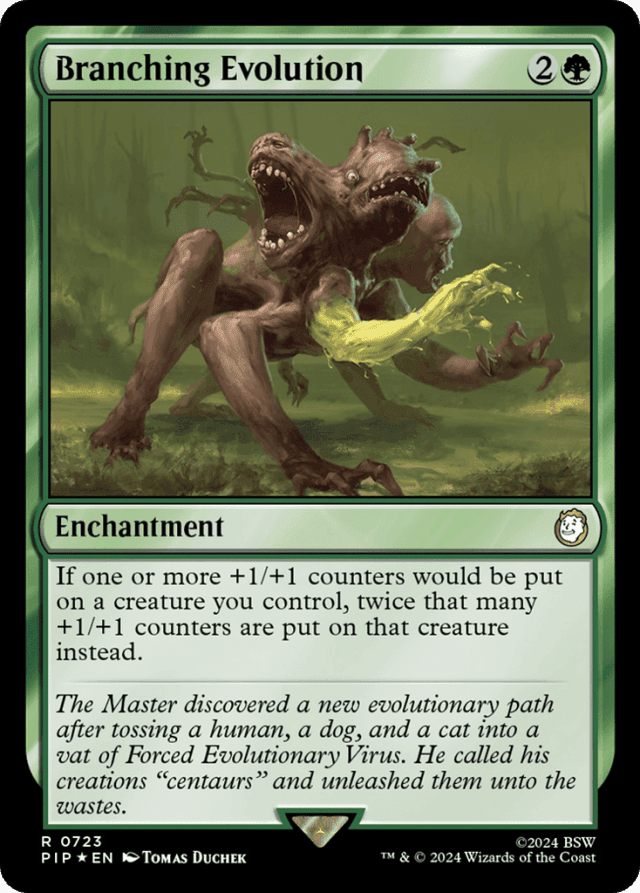 If a creature you control would enter the battlefield with a number of +1/+1 counters on it, it enters with twice that many instead. — If two or more effects attempt to modify how many counters would be put onto a creature you control, you choose the order to apply those effects, no matter who controls the sources of those effects. — If you control two Branching Evolutions, the number of +1/+1 counters put on a creature is four times the original number. Three Branching Evolutions multiplies the original number by eight, and so on.