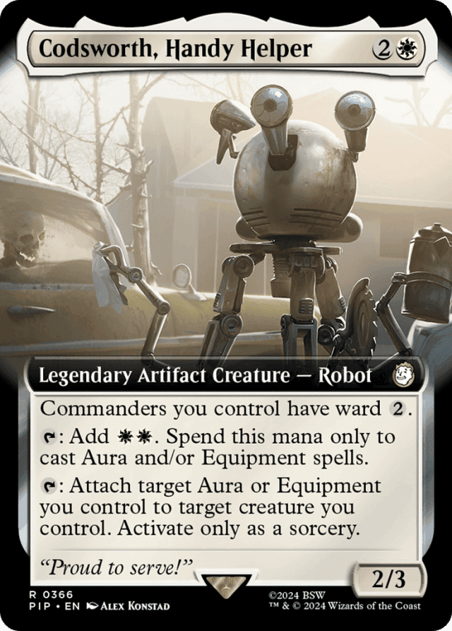 As Codsworth’s last ability resolves, if the target Aura or Equipment can’t legally be attached to the target creature (for example, because the creature has protection from enchantments or protection from artifacts), the target Aura or Equipment won’t move. — If either target of Codsworth’s last ability is an illegal target as the ability resolves, the ability won’t do anything. If both targets are illegal, the ability won’t resolve. If the target Aura or Equipment is already attached to the target creature, nothing happens. — Once a commander’s ward ability has triggered, causing that commander to lose ward by removing Codsworth won’t affect the ability. The appropriate player will still have to pay {2} or see their spell or ability countered. — The Aura or Equipment you target with Codsworth’s last ability doesn’t have to be attached to a creature you control when you target it. You just have to control the Aura or Equipment you’re targeting as well as the creature you’re targeting. — You can’t spend mana generated by Codsworth’s second ability to activate abilities of Auras or Equipment. This includes paying equip costs.