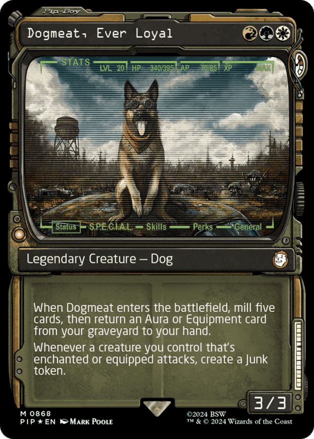When Dogmeat enters, mill five cards, then return an Aura or Equipment card from your graveyard to your hand. Whenever a creature you control that's enchanted or equipped attacks, create a Junk token. (It's an artifact with "{T}, Sacrifice this token: Exile the top card of your library. You may play that card this turn. Activate only as a sorcery.")
