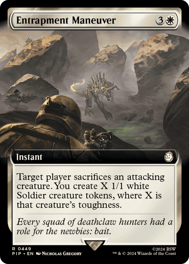An "attacking creature" is one that has been declared as an attacker or put onto the battlefield attacking during this combat. Unless that creature leaves combat, it continues to be an attacking creature through the end of combat step, even if the player it was attacking has left the game or the planeswalker it was attacking has left combat. — Entrapment Maneuver doesn't target the creature to be sacrificed. The target player chooses one as it resolves. No player may take any other actions between the target player choosing the creature and you creating Soldier tokens. — If you cast Entrapment Maneuver after combat damage has been dealt, only creatures that survived combat can be sacrificed. — To determine how many Soldier tokens are created, use the toughness of the sacrificed creature as it last existed on the battlefield.