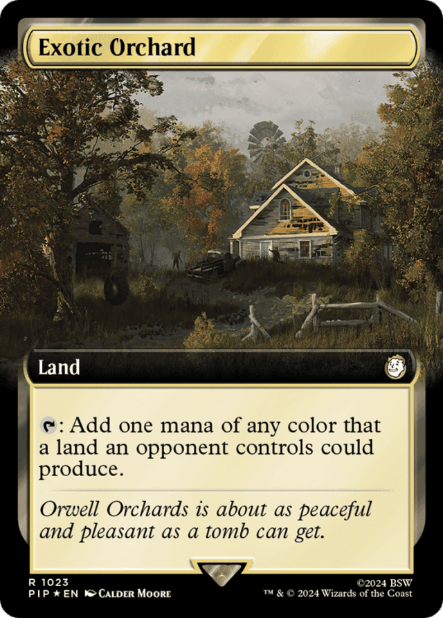 Exotic Orchard checks the effects of all mana-producing abilities of lands your opponents control, but it doesn't check their costs. For example, Vivid Crag has the ability "{T}, Remove a charge counter from Vivid Crag: Add one mana of any color." If an opponent controls Vivid Crag and you control Exotic Orchard, you can tap Exotic Orchard for any color of mana. It doesn't matter whether Vivid Crag has a charge counter on it, and it doesn't matter whether it's untapped. — Exotic Orchard doesn't care about any restrictions or riders your opponents' lands (such as Ancient Ziggurat or Hall of the Bandit Lord) put on the mana they produce. It just cares about colors of mana. — Lands that produce mana based only on what other lands "could produce" won't help each other unless some other land allows one of them to actually produce some type of mana. For example, if you control an Exotic Orchard and your opponent controls an Exotic Orchard and a Reflecting Pool, none of those lands would produce mana if their mana abilities were activated. On the other hand, if you control a Forest and an Exotic Orchard, and your opponent controls an Exotic Orchard and a Reflecting Pool, then each of those lands can be tapped to produce {G}. Your opponent's Exotic Orchard can produce {G} because you control a Forest. Your Exotic Orchard and your opponent's Reflecting Pool can each produce {G} because your opponent's Exotic Orchard can produce {G}. — The colors of mana are white, blue, black, red, and green. Exotic Orchard can't be tapped for colorless mana, even if a land an opponent controls could produce colorless mana. — When determining what colors of mana your opponents' lands could produce, Exotic Orchard takes into account any applicable replacement effects that would apply to those lands' mana abilities (such as Contamination's effect, for example). If there are more than one, consider them in any possible order.