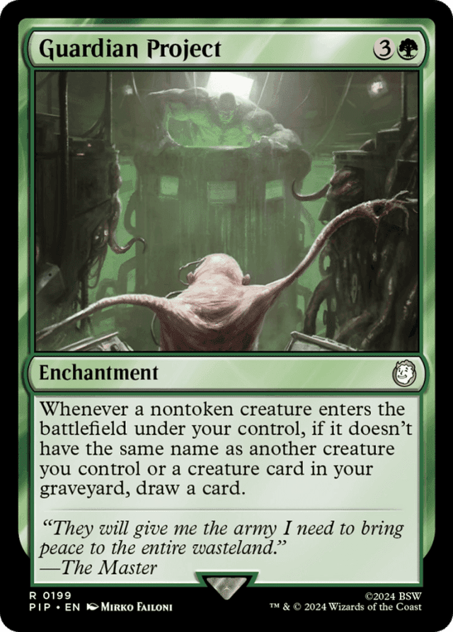 A face-down creature has no name, so it can't share a name with anything. This includes other creatures with no name. — If the entering creature is put into your graveyard while Guardian Project's ability is on the stack, that same card will be a creature card in your graveyard that shares a name with the creature that was on the battlefield, so you won't draw a card. — If the entering creature leaves the battlefield and returns while Guardian Project's ability is on the stack, that same card will be a new creature you control that shares a name with the creature that was on the battlefield, so you won't draw a card. However, Guardian Project's ability may trigger for the new creature and you may draw a card as that ability resolves. — Whether the entering creature shares a name with a creature you control or a creature card in your graveyard is checked both as that creature enters and as Guardian Project's ability resolves. If the entering creature isn't the first of its name as it enters, the ability doesn't trigger at all; if its name is shared as the ability resolves, you don't draw a card.
