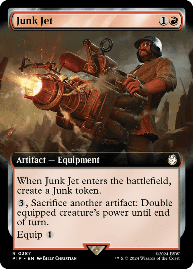When this Equipment enters, create a Junk token. (It's an artifact with "{T}, Sacrifice this token: Exile the top card of your library. You may play that card this turn. Activate only as a sorcery.") {3}, Sacrifice another artifact: Double equipped creature's power until end of turn. Equip {1}