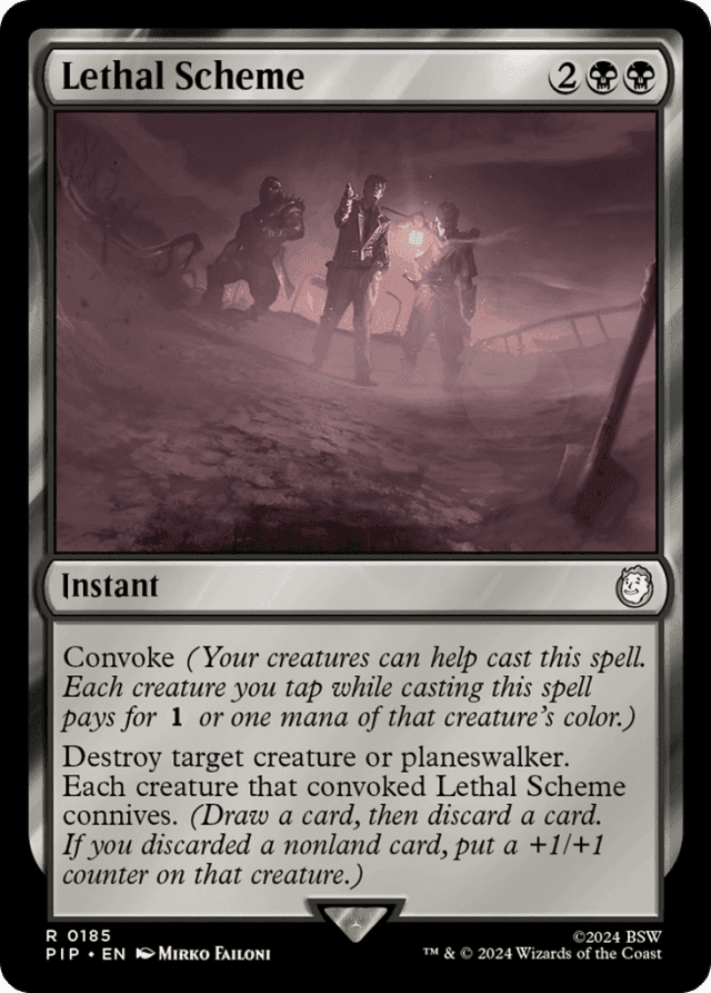 If a resolving spell or ability instructs a specific creature to connive but that creature has left the battlefield, the creature still connives. If you discard a nonland card this way, you won't put a +1/+1 counter on anything. Abilities that trigger "when [that creature] connives" will trigger. — If no card is discarded, most likely because that player's hand is empty and an effect says they can't draw cards, the conniving creature does not receive a +1/+1 counter. — Once an ability that causes a creature to connive begins to resolve, no player may take any other actions until it's done. Notably, opponents can't try to remove the conniving creature after you discard a nonland card but before it receives a counter. — When multiple creatures are instructed to connive simultaneously, they connive one at a time in the order of their controller's choice. — You can't tap more creatures to convoke Lethal Scheme than it takes to pay for its total cost. This means that normally no more than four creatures can convoke it. — Because convoke isn't an alternative cost, it can be used in conjunction with alternative costs. — If a creature you control has a mana ability with {T} in the cost, activating that ability while casting a spell with convoke will result in the creature being tapped before you pay the spell's costs. You won't be able to tap it again for convoke. Similarly, if you sacrifice a creature to activate a mana ability while casting a spell with convoke, that creature won't be on the battlefield when you pay the spell's costs, so you won't be able to tap it for convoke. — Tapping a multicolored creature using convoke will pay for {1} or one mana of your choice of any of that creature's colors. — Tapping an untapped creature that's attacking or blocking to convoke a spell won't cause that creature to stop attacking or blocking. — When calculating a spell's total cost, include any alternative costs, additional costs, or anything else that increases or reduces the cost to cast the spell. Convoke applies after the total cost is calculated. Convoke doesn't change a spell's mana cost or mana value. — You can tap any untapped creature you control to convoke a spell, even one you haven't controlled continuously since the beginning of your most recent turn.