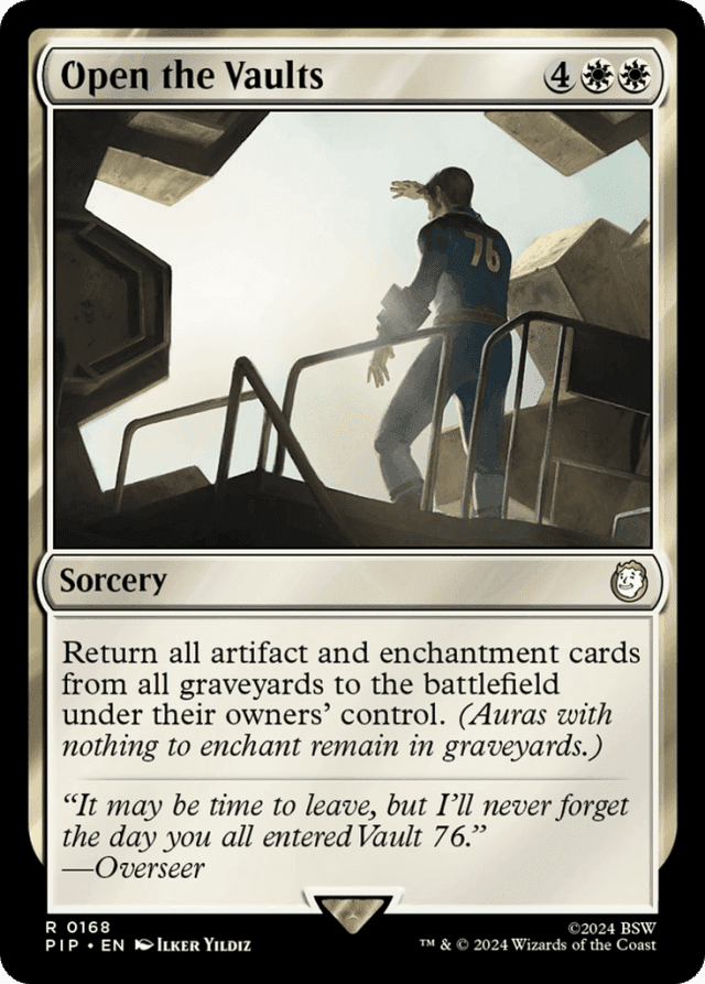 An Aura put onto the battlefield this way can't enchant an artifact or enchantment that's also being put onto the battlefield with Open the Vaults. — If an Aura can be returned to the battlefield with Open the Vaults, it must be, even if its owner doesn't like what it would enchant. — If an Aura is put onto the battlefield without being cast, the Aura's controller-to-be chooses what it will enchant as it enters the battlefield. An Aura put onto the battlefield this way doesn't target anything (so it could be attached to an opponent's permanent with hexproof, for example), but the Aura's enchant ability restricts what it can be attached to. If the Aura can't legally be attached to anything, it remains in its current zone. — If multiple players have Auras in their graveyards, the player whose turn it is announces what their Auras will enchant, then each other player in turn order does the same, then all artifacts and enchantments (including both Auras and non-Auras) enter the battlefield at the same time.