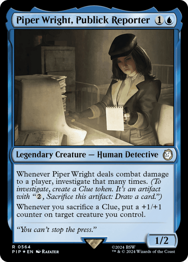 Whenever Piper Wright deals combat damage to a player, investigate that many times. (To investigate, create a Clue token. It's an artifact with "{2}, Sacrifice this token: Draw a card.") Whenever you sacrifice a Clue, put a +1/+1 counter on target creature you control.