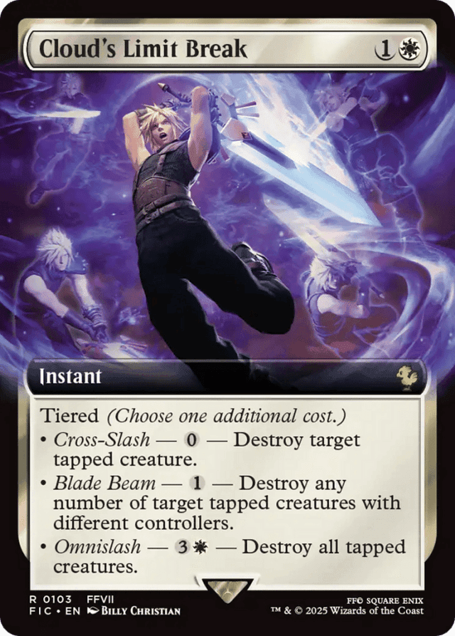 Tiered (Choose one additional cost.) • Cross-Slash — {0} — Destroy target tapped creature. • Blade Beam — {1} — Destroy any number of target tapped creatures with different controllers. • Omnislash — {3}{W} — Destroy all tapped creatures.