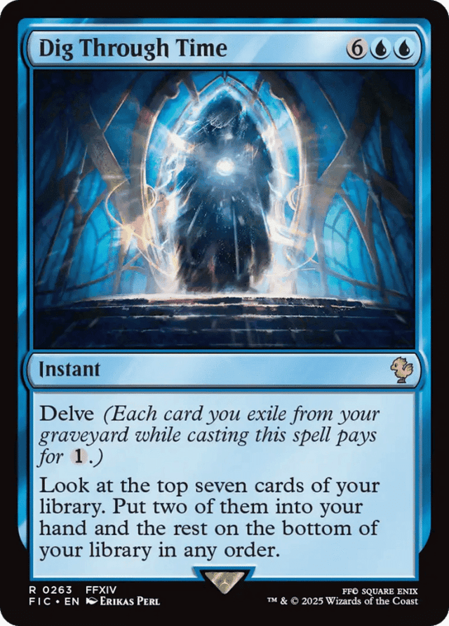 Delve (Each card you exile from your graveyard while casting this spell pays for {1}.) Look at the top seven cards of your library. Put two of them into your hand and the rest on the bottom of your library in any order.