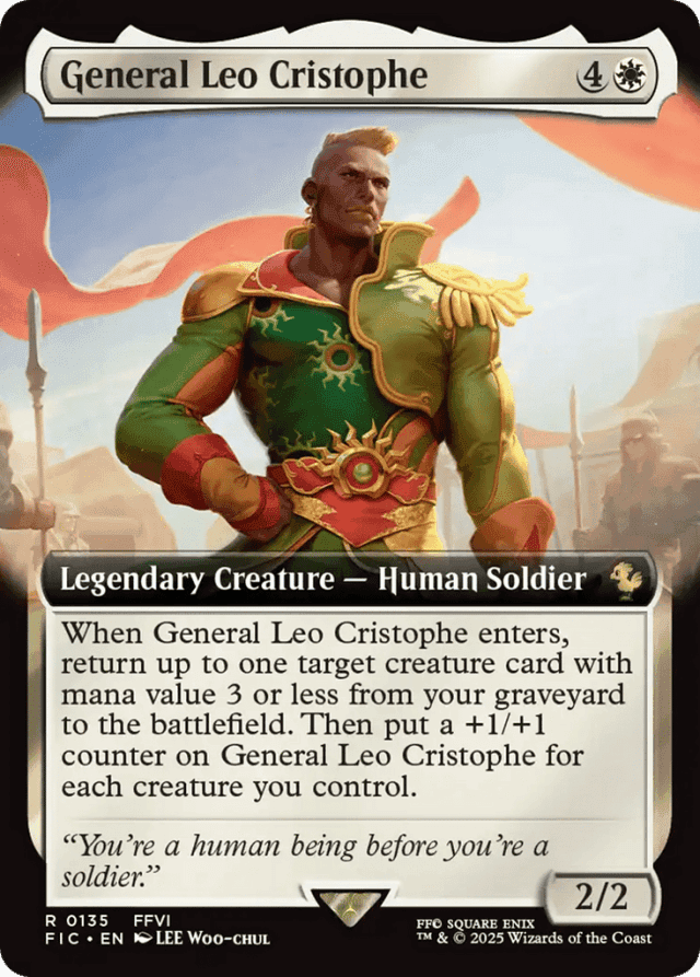 When General Leo Cristophe enters, return up to one target creature card with mana value 3 or less from your graveyard to the battlefield. Then put a +1/+1 counter on General Leo Cristophe for each creature you control.