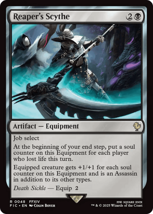 Job select At the beginning of your end step, put a soul counter on this Equipment for each player who lost life this turn. Equipped creature gets +1/+1 for each soul counter on this Equipment and is an Assassin in addition to its other types. Death Sickle — Equip {2}