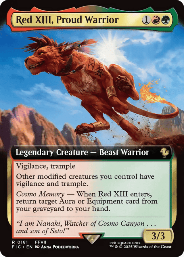 Vigilance, trample Other modified creatures you control have vigilance and trample. (Equipment, Auras you control, and counters are modifications.) Cosmo Memory — When Red XIII enters, return target Aura or Equipment card from your graveyard to your hand.