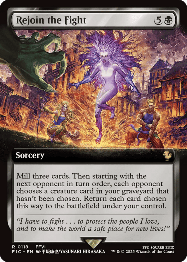Mill three cards. Then starting with the next opponent in turn order, each opponent chooses a creature card in your graveyard that hasn't been chosen. Return each card chosen this way to the battlefield under your control.