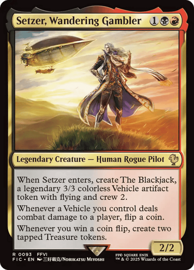 When Setzer enters, create The Blackjack, a legendary 3/3 colorless Vehicle artifact token with flying and crew 2. Whenever a Vehicle you control deals combat damage to a player, flip a coin. Whenever you win a coin flip, create two tapped Treasure tokens.