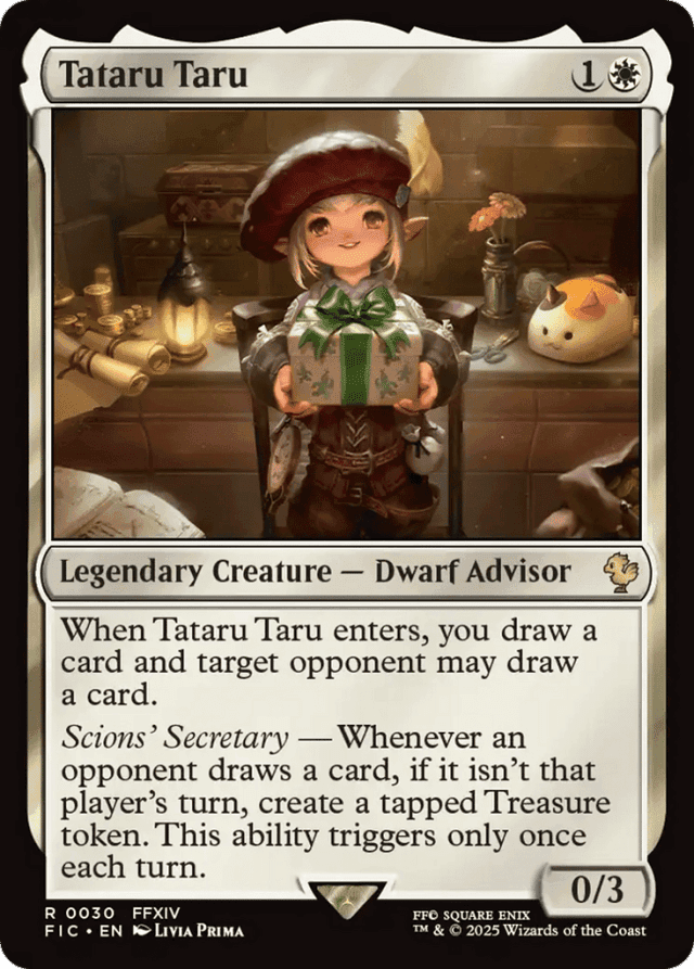 When Tataru Taru enters, you draw a card and target opponent may draw a card. Scions' Secretary — Whenever an opponent draws a card, if it isn't that player's turn, create a tapped Treasure token. This ability triggers only once each turn.