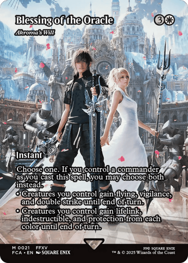 Choose one. If you control a commander as you cast this spell, you may choose both instead. • Creatures you control gain flying, vigilance, and double strike until end of turn. • Creatures you control gain lifelink, indestructible, and protection from each color until end of turn.