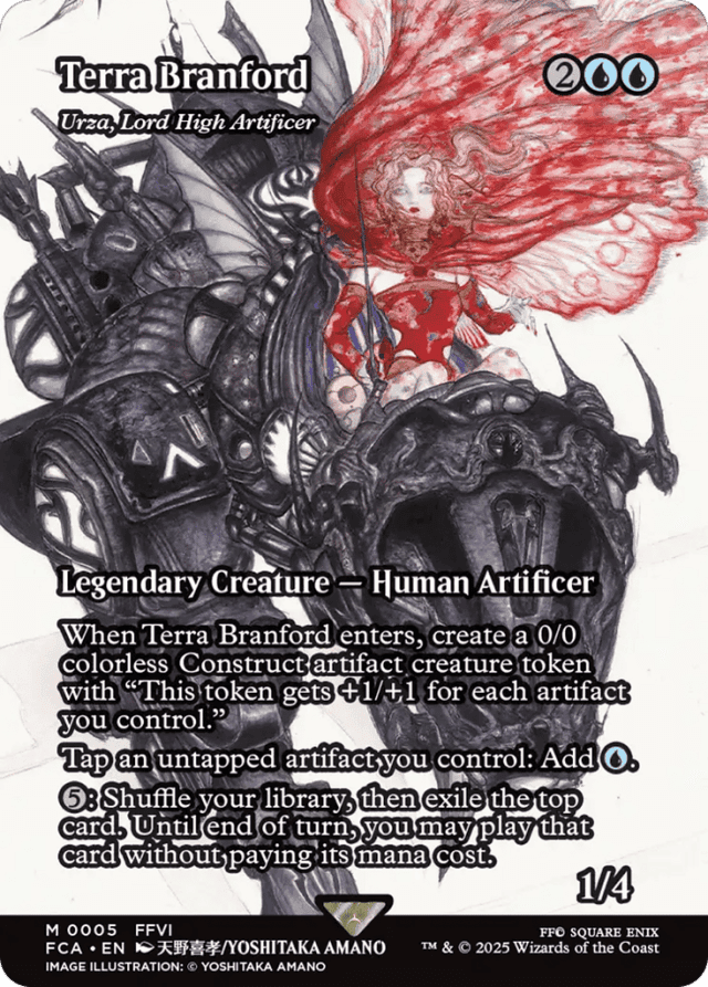 When Urza enters, create a 0/0 colorless Construct artifact creature token with "This token gets +1/+1 for each artifact you control." Tap an untapped artifact you control: Add {U}. {5}: Shuffle your library, then exile the top card. Until end of turn, you may play that card without paying its mana cost.