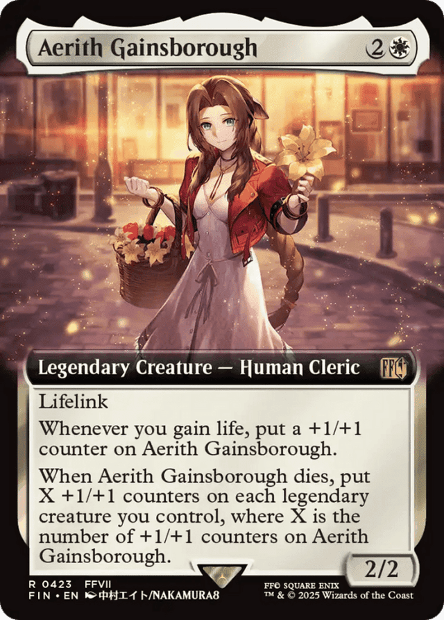 Lifelink Whenever you gain life, put a +1/+1 counter on Aerith Gainsborough. When Aerith Gainsborough dies, put X +1/+1 counters on each legendary creature you control, where X is the number of +1/+1 counters on Aerith Gainsborough.